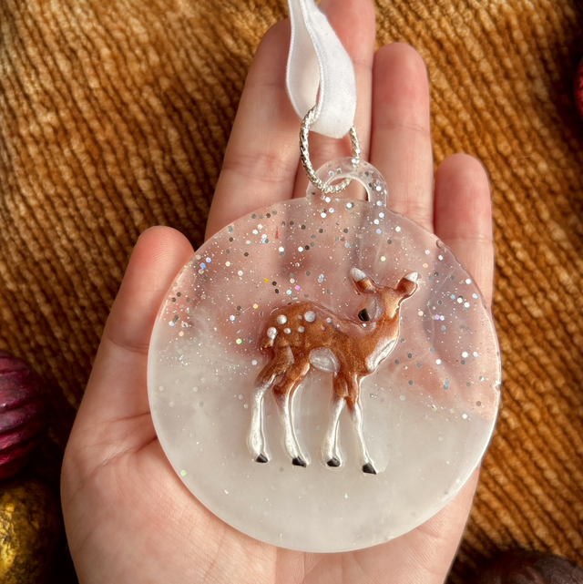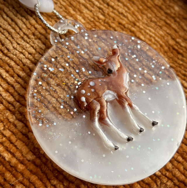 This Beautiful Christmas decoration features a 3D dear against a white and clear background with silver glitter.