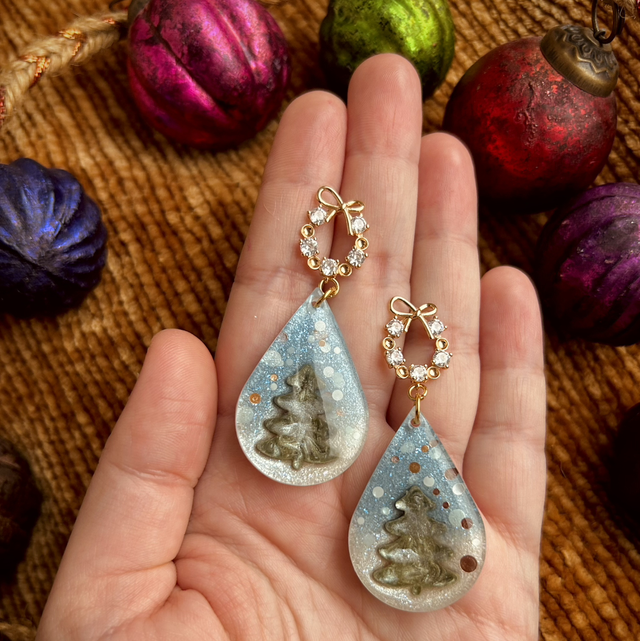 Christmas Tree and Wreath Teardrop Earrings - Baby Blue