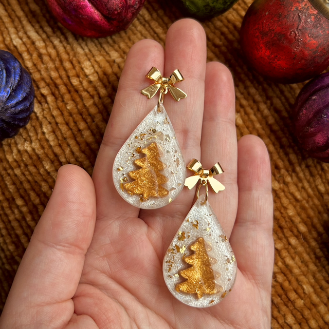 Christmas Tree Teardrop Earrings - Gold and White