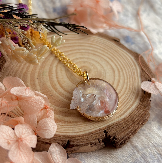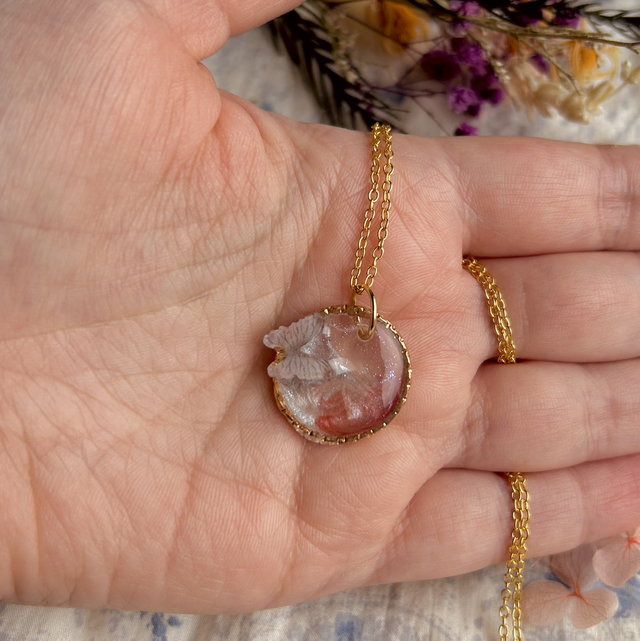 This dainty necklace features a twisted circular surround and is filled with translucent pastel toned resin, clear resin with blue reflect glitter and a 3D butterfly accent.