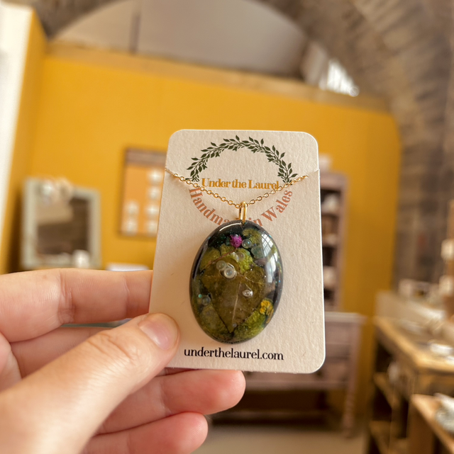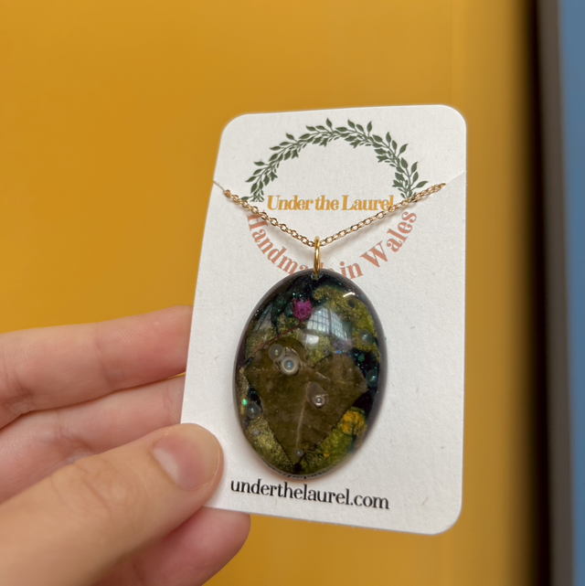 Inspired by my garden on a rainy autumn day, this necklace features green resin, iridescent glass bubble “dew drops” and a hand picked and dried ivy leaf.