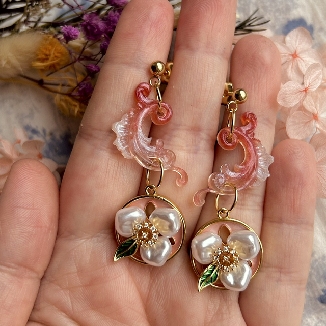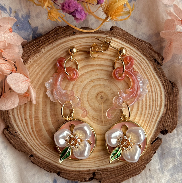 These ornate stud earrings are cast in various tones of blush resin. They feature beautiful faux pearl floral charms.