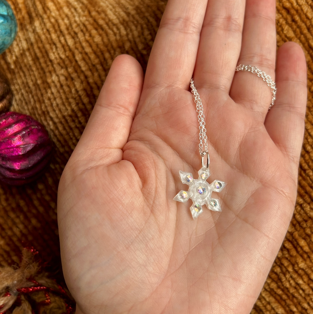 Snowflake Necklace Dainty - White and Iridescent