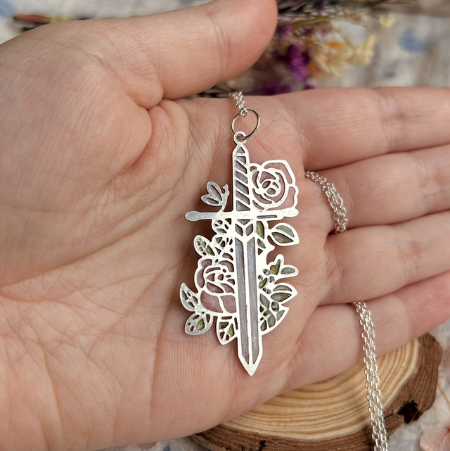 This statement necklace features a sword and rose bezel which I’ve carefully filled with pastel toned resin.