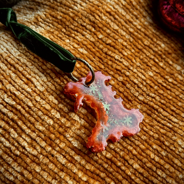 Rust edges with clear centre filled with white snowflake glitter and iridescent green glitter